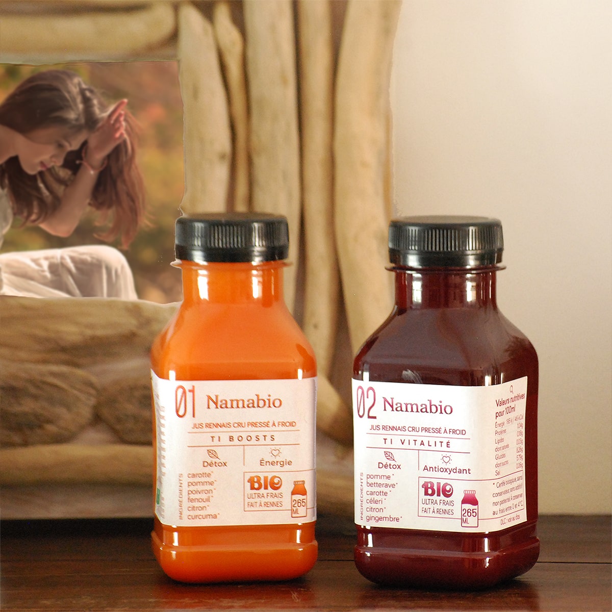Les jus ultra-frais de Namabio sont sans additif, sans conservateur, non pasteurisés, confectionnés avec des fruits et des légumes de saison issus de l’agriculture biologique.